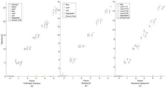 Bollmeyer et al. [18] use barometers for medical applications in which a precise altitude estimation of the patient’s body is needed. A challenge in this case is the disturbances due to macroscopic flow, such as the influence of ventilation, the opening and closing of doors, or the weather. Calibration between sensors is also needed, in order to compensate for the offset between different sensors. In their research, they created a small sensor network, with sensors attached to the patient body, as well as a reference stationary sensor. They measure a maximum error of 21 cm, but they suggest that a second sensor might reduce the maximum error to 10 cm. However, in our application scenario, we do not focus on such accurate vertical localization; we are looking for an infrastructure-independent approach.