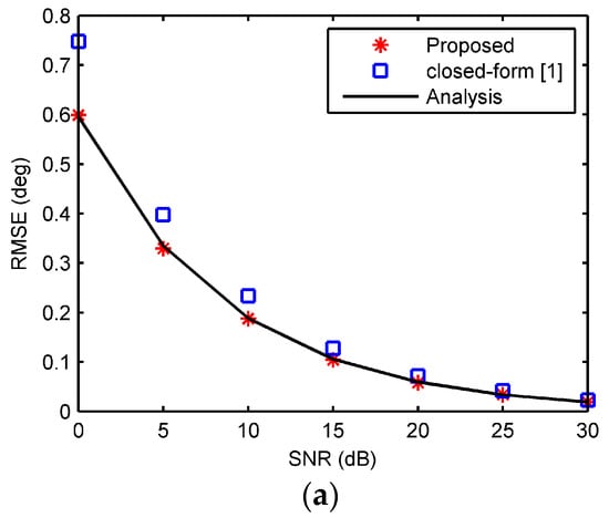 In order to compare with the closed-form algorithm [1], assuming only sampling noises exist, a UCA consisting of 16 elements with a radius of is exemplified. The number of snapshots was 200. In the first example, phase noises were considered as AWGN with SNR from 0 dB to 30 dB. 500 Monte Carlo simulations were run for calculating 3-D localization parameters employing (18)–(21). The root mean square errors (RMSEs) of elevation angle, azimuth angle, and range were estimated for performance evaluation. Note that the RMSE of range estimation was normalized by the array radius. The source was fixed at . The performance of the proposed algorithm against SNRs is shown in Figure 3. The estimations of the closed-form algorithm [1] with l = 3 and the analysis results described in (31), (32), and (34) are also shown for comparison. As shown in Figure 3, the RMSEs of 3-D localization estimations agree with the analysis in Section 4. The RMSEs by [1] are larger than the proposed algorithm and hence less accurate, in that the LSE in [1] has fewer terms than the number of sensors.