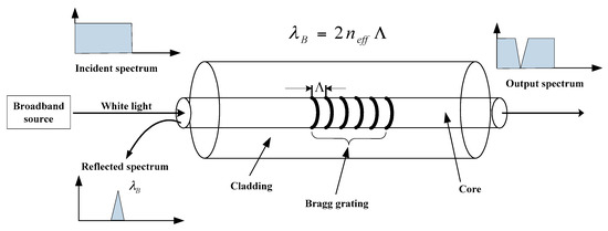 Generally, an optical fiber sensor system consists of a light transmitter, a receiver, an optical fiber, a modulator element and a signal processing unit. As the core part of an optical fiber sensor, the optical fiber itself can act as a sensing element or carry the light from the source to the modulator element, which is usually made from silica glass or polymer material. In accordance with the change of grating spacing, the optical fiber sensor modulates the light and reflects back an optical signal to the analytical unit for deriving the concerned physical quantity of the structure [5]. Up to now, the FBG sensor has been widely used in monitoring of civil engineering structures. It can be regarded as a type of optical fiber sensor with varied refractive indices in the core. According to the Bragg’s law, a beam of white light is written in the FBG sensor and when the light from the broadband source passes through the grating at a particular wavelength, the Bragg wavelength λB is reflected, which is related to the effective index of refraction neff and the grating period Λ, as illustrated in Figure 1.