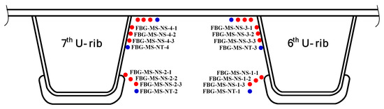 In this study, an FBG-based SHM system was instrumented on a steel bridge crossing the Beijing-Hangzhou Grand Canal located in Hangzhou, China as shown in Figure 2. This system is mainly comprised of FBG sensors, transmission fibers and an interrogator. A total of 16 measurement regions (for each region, it consists of three strain measurement points and one temperature compensation point) are selected for sensor deployment on the critical welded joints at the mid-span and quarter-span sections. The selection of welded joints in each section is primarily based on the literature such as the fatigue-prone rib-to-deck and rib-to-diaphragm with cutout welded joints. The installation locations of the FBG sensors are illustrated in Figure 3, Figure 4 and Figure 5. In detail, four FBG sensors are installed on each measurement area of the 6th and 7th U-rib in the orthotropic steel deck at the mid-span and quarter-span of the bridge. In this study, the measurement areas are relative narrow and we need to install three FBG sensors in a length of 15 mm to capture the stress values at the locations of 5 mm, 15 mm and 20 mm away from the weld toe. The short grating region will cause weak reflected light. In recognition of this, the FBG sensors with a grating region of 1 mm long are customized and the effectiveness the FBG sensors is verified by the sensor supplier. According to the test report, the reflectivity of these FBG sensors is more than 85%. The reflection center wavelengths of the FBG sensors are ranged from 1526 nm to 1561 nm. The interrogator with 16 channels is used in this study and four FBG sensors are linked to each channel.
