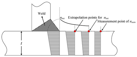 The hot spot stress, resulting from the local stress concentration due to geometric irregularity and discontinuity at the welded joint, is difficult to determine due to the extremely complicated stress distribution in the vicinity of the weld toe. It is commonly obtained by numerical simulations or experimental measurements. According to the IIW specification, the welded joints can be classified into three types (a, b and c) according to the location of hot spot and the weld pattern. In this study, the welded joint adjacent to sensor FBG-MS-NS-2-3 is chosen for case study, which belongs to type b. The hot spot stress of the welded joint is derived based on the stress at the location 5 mm away from the weld toe, σ5mm measured by sensor FBG-MS-NS-2-1 and the stress at the location 15 mm away from the weld toe, σ15mm measured by sensor FBG-MS-NS-2-2. According to the extrapolation method for type b, it can be calculated by [31]: