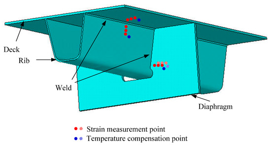 For an instrumented SHM system, the effectiveness of the raw monitoring data should be examined and verified according to the data variation tendency. In this study, the FBG-based system was implemented during the bridge construction period and therefore the raw data of each FBG sensor during the bridge construction and operation periods can be obtained. The FBG temperature sensor numbered FBG-MS-NT-2 and the FBG strain sensor numbered FBG-MS-NS-2-3 are selected herewith to perform the original data analysis and comparative study. The selected two sensors are located in the vicinity of the welded joint of the 7th U-rib to diaphragm at the mid-span of the investigated steel bridge. In particular, the sensor FBG-MS-NS-2-3 is located at the position with a distance of 15 mm away from the welded joint and the sensor FBG-MS-NT-2 is close to the sensor FBG-MS-NS-2-3, as illustrated in Figure 3.