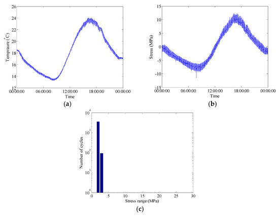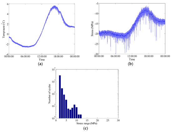 Raw data of selected FBG sensors during bridge operation phase on 29 December 2015: (a) Temperature time history measured by FBG-MS-NT-2; (b) Stress time history measured by FBG-MS-NS-2-3; (c) Histogram of daily stress spectrum.
