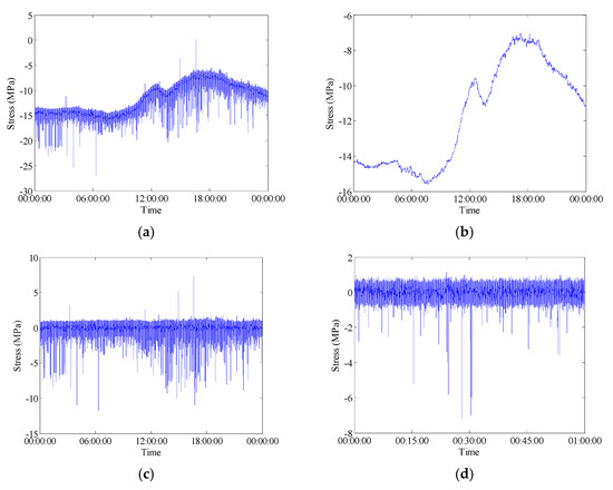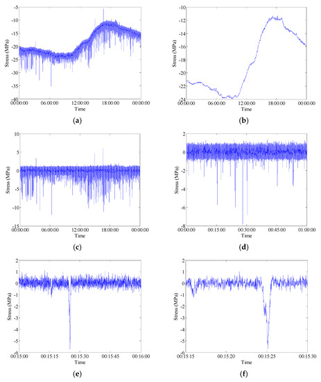 In general, the in-service strain monitoring data acquired from the sensor deployed on a specific position of the bridge are composed of the live-load and temperature induced components. As described in literature [2], there are trend ingredients (low-frequency components) in the stress time histories which can be attributed to be the daily cycle effect of temperature variation. In order to examine the percentage of stress caused by different kinds of loading such as the live-load and temperature, the wavelet multi-resolution analysis approach is used to decompose the raw data into high-frequency and low-frequency components. Wavelet multi-resolution analysis allows a decomposition of the signal into various resolution scales: the data with coarse resolution contain the information about low-frequency components and the data with fine resolution contain the information about high-frequency components [34]. The measured strain signals can be decomposed into approximations and details (i.e., high-frequency and low-frequency components) at various levels. For each level, the high-frequency part (details) is separated and the remaining low-frequency part (approximations) is transferred into the next level of decomposition. Through the wavelet multi-resolution analysis, the strain component attributable to temperature effect can be obtained from the lowest-frequency part in the wavelet transform domain. Figure 8 and Figure 9 illustrate the wavelet-based decomposed stress time histories for the selected FBG strain sensors. In these time histories, the low-frequency parts of 12-level decomposition of stress data represent the reconstructed temperature-induced stress. A comparison analysis between the initial stresses and the temperature-induced stresses indicates that the temperature-induced stress time histories have the same variation tendency and periodic characteristic in one day. The temperature-induced stress takes a major part of the total stress which means that the main stress change during the bridge operation stage is caused by the temperature effect. Figure 8 and Figure 9 also show that the high-frequency parts of 12-level decomposition of stress data induced by live load. The stress histories induced by live load are presented at different time scales (1 day, 1 h, 1 min and 15 s) to show the nature of the signal.