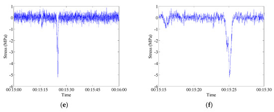 Raw data measured by FBG-MS-NS-2-2: (a) Stress time history; (b) Temperature time history; (c) Live-load induced history (d) Live-load induced stress time history in 1 h; (e) Live-load induced stress time history in 1 min; (f) Live-load induced stress time history in 15 s.