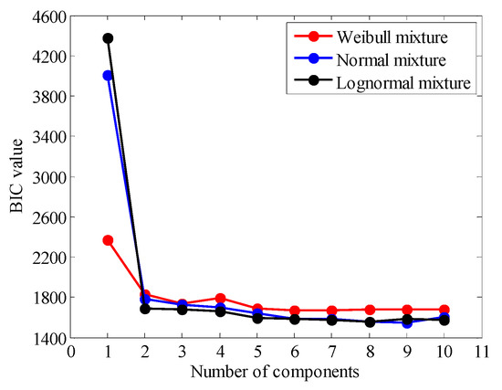 To consider if the stress spectra match the selected statistical distribution models, the candidate distribution models with different components need to be compared and then selected based on the fit performance. In this study, the Bayesian information criterion (BIC) is used to determine the number of components and choose an optimal model of the stress spectrum.