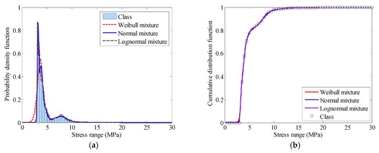 Distribution function of stress range: (a) Finite mixture PDFs; (b) Finite mixture CDFs.