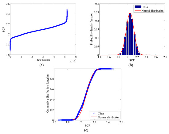 Stochastic property of SCF: (a) SCF data in an ascending order; (b) PDF of SCF; (c) CDF of SCF.