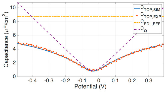 Measured top-gate capacitance as a function of potential using electrochemical impedance spectroscopy. CTOP,EXP (dotted red) is the measured top-gate capacitance, CEDL,EFF (dash-dot yellow) is the effective electric double layer capacitance, CQ (dashed purple) is the quantum capacitance, and CTOP,SIM (blue) is the simulated top-gate capacitance. CTOP,SIM consists of the effective double layer capacitance in series with the graphene quantum capacitance.