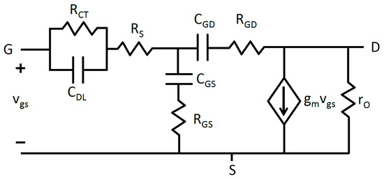 The graphene EGFETs under study are three terminal devices possessing source, drain, and gate terminals. All voltages and currents are referenced with respect to the source terminal making , , and an exhaustive list of the voltages and currents of interest. Small signal intrinsic voltage gain is defined as , where is the transconductance, which is defined as , and is the output impedance defined as . Development of a frequency-dependent graphene EGFET small-signal model requires an accurate model for electrode-electrolyte interfaces. This is accomplished using a simplified Randles circuit as given by Figure 3 [38,39].