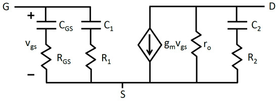 and represent the series resistances at the drain and source terminals, respectively. Because and contact resistances and are much less than , Equation (14) reduces to the DC gain previously described in Equation (11). Thus, contact resistances may be safely neglected in small-signal circuit models used to calculate amplifier gain and frequency response.