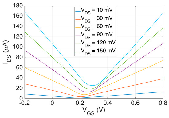 DC data was acquired by sweeping from −0.2 to 0.8 V and from 10 mV to 150 mV. The step size was 10 mV for both and . The step rate was 500 ms per 10 mV. A ten second hold time was allotted when resetting from 0.8 V to −0.2 V and incrementing by 10 mV. Further increasing the hold time and decreasing the sweep rate had little effect on the DC curves meaning sufficient time was given for the ions to redistribute at the graphene-electrolyte interface and for the electric double layer to reach steady state. Full DC characterization consists of over 1500 data points. A conventional representation of the graphene EGFET DC characteristic is presented in Figure 7.