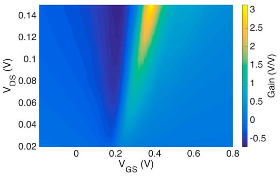 Intrinsic gain for the graphene EGFET was calculated by taking partial derivatives with respect to and . Recall that intrinsic gain , where is and is . Partial derivatives of the graphene DC characteristic are calculated numerically using finite differences to produce Figure 8.