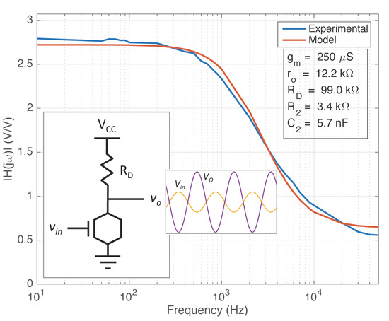 The measured CS amplifier magnitude response was fit to the newly developed small-signal model for graphene EGFETs as shown by Figure 9. The CS amplifier reference schematic is provided as an inset in Figure 10 for convenience. Fitting was achieved using bounded simulating annealing in conjunction with a least squares error function. Transconductance was estimated at 250 μS from the DC characterization data previously obtained for a operating bias of 150 mV. Small-signal model parameters, , , and were extracted as 12.2 kΩ, 3.4 kΩ, and 5.7 nF, respectively. The experimental data verifies the presence of parasitic capacitance , which is responsible for the roll-off in gain. The experimental magnitude response also verifies the presence of resistance at the output, a unique feature in graphene EGFETs stemming from electrolyte solution resistance . Maximum gain, cutoff frequency, and transition frequency were found to be approximately 2.8 V/V, 2.0 kHz, and 7.8 kHz, respectively.