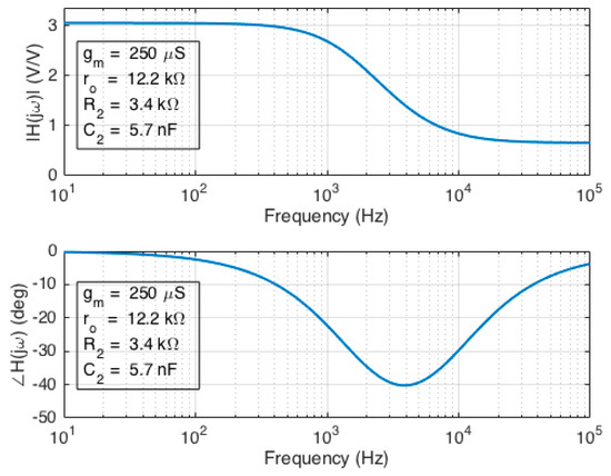 The intrinsic magnitude response of the graphene EGFET is readily computed due to its similarity to the CS amplifier magnitude response (Equations (4) and (11)). Corresponding intrinsic phase response was computed using the extracted parameter values previously listed. A Bode plot for the intrinsic graphene EGFET magnitude and phase response is shown in Figure 10. The maximum intrinsic gain was found to be 3.1 V/V, the cutoff frequency was 1.9 kHz, and the transition frequency occurs at approximately 6.9 kHz. The corresponding equations for intrinsic graphene EGFET magnitude response and phase response are provided by Equations (12) and (13).