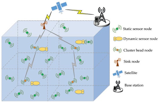 As shown in Figure 1, the entire volume is divided into several sub-volumes and the network is a clustered structure. Each sub-volume contains three kinds of nodes including a cluster head node hi, a glider gi and multiple static sensor nodes . A static node is anchored to the sea floor by cables and floats in the water aided by buoyancy devices. Its function is to collect and forward the environmental data to complete the conventional monitoring tasks. All static nodes have the same sensing range and communication range. The cluster head node is the only one in each sub-volume. The cluster head node is responsible for receiving the data forwarded by the static and dynamic nodes. In addition to this, the cluster head node can collect the status information of whether the link is disrupted in its sub-volume. Every cluster head node then sends the collected information to the cluster head nodes of the upper sub-volume so that the collected data is transmitted to sink nodes layer by layer. Finally, the sink node will send the combined data to a satellite or shore base station through radio communication. The dynamic node in our paper is a glider. On the one hand, the glider has a common function with static nodes. It can collect and forward environmental data. On the other hand, to a certain extent the dynamic nodes can freely move and act as an advanced sensor node. Every glider would periodically pass through the cluster head nodes to forward the collected data information to the cluster head node in its sub-volume.