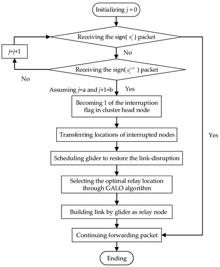 - If the cluster head hi receives the sign () packet sent by , it indicates that there is no disruption of all links between static node and the cluster head hi. If the cluster head hi does not receive the sign () packet sent by but receives the sign () packet of the next hop , then it judges the link ej,j+1 between and to be disrupted and the link disruption identifier in hi therein becomes δj,j+1 = 1. If the cluster head hi does not receive the sign () packet sent by , then it does j = j + 1 and continues to judge until the cluster head can receive from the next hop. Then the cluster head can judge the disrupted link eab, where b = a + 1. If there are some simultaneous link disruptions, the glider will prioritize the link closest to the cluster head node to ensure the connectivity of more nodes.