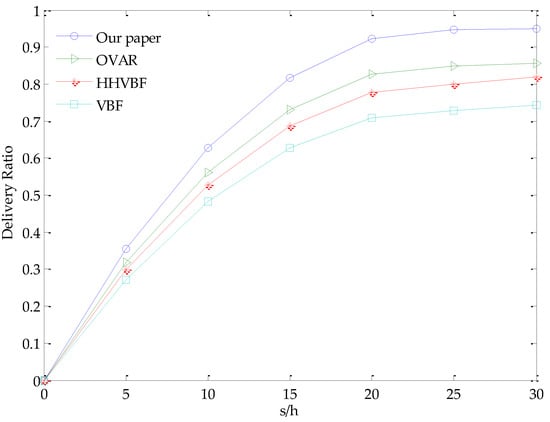 In the simulation, the parameter s/h varies between 0 and 30 with a step of 5. As shown in Figure 4, by comparing the packet delivery rate with the change of the parameter s/h, we can conclude that the packet delivery rate is also closer to the ideal value 1 as the parameter s/h increases. The rate of increase of data packet delivery is faster at first and slower later because the network connectivity is particularly poor when the nodes are sparsely distributed. In this case, adding nodes will have a greater impact on network connectivity. However, when the number of nodes reaches a certain critical value, for example, when the parameter s/h in the figure is 20, the rate of packet delivery increases quite slowly because the network is basically connected. At this point if the number of nodes increases, the connectivity is improved less obviously. Therefore, in the following simulations, we perform other simulations based on the parameter s/h = 20. Compared with OVAR, HHVBF and VBF, the glider-assisted link-disruption restoration mechanism has a higher packet delivery rate with the same s/h value. For example, when the parameter s/h is 20, in the glider-assisted link-disruption restoration mechanism, the packet delivery rate has increased by 15%, 23% and 33%, respectively, relative to OVAR, HHVBF and VBF. This is because in the glider-assisted link disruption restoration mechanism, when a certain link in the network is disrupted due to change of underwater acoustic channel or external force in the ocean, the cluster head node in each sub-volume will notify the glider to perform restoring the link in time. For both the links among common nodes and the key nodes, the glider can do the repair, which greatly improves the delivery rate of the data packets in the network.