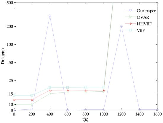 Based on the simulation in Figure 4, our simulation parameter s/h is 20. As shown in Figure 5, the end-to-end delay of the glider-assisted link-disruption restoration mechanism respectively is 20%, 38% and 43% lower than OVAR, HHVBF and VBF when there is no link disruption and the time is less than 200 s. This is because the glider-assisted link disruption restoration mechanism is based on the shortest path routing protocol. Shortest path routing has less time-delay than VBF and the HHVBF and OVAR protocols. For a sudden disruption of the link after 200 s, all of four algorithms restore the broken link. OVAR, HHVBF, and VBF rerouted the topology in a relatively shorter period of time by bypassing to repair the disrupted link. At this time, the glider-assisted link disruption restoration mechanism takes a relatively longer time to wait for the glider to assist in repairing the disrupted link. However, when the link returns to its original state, the glider-assisted link disruption restoration mechanism does not need to spend more time and energy on reconstructing the network topology to return to the original optimal state. OVAR, HHVBF, and VBF will continue to maintain the suboptimal state of the network for some time from 400 s to 1000 s in the following period, or spend a certain amount of time and energy on reconstructing back to the original optimal state. When a link in the network is disrupted for 1000 s, for the glider-assisted link disruption restoration mechanism, the previous process is continued for link restoration. For other algorithms, however, the link repair is not done within the simulation time. This may be due to the link between the key nodes being disrupted, for example, the link between the cluster head node and its upper-level node, so that the link cannot be repaired no matter how the path is detoured or the topology is reconstructed. Only when the link environment changes again these mechanisms may restore the disrupted link to the original state, thereby restoring link connectivity. At this time, the advantages of the glider-assisted link disruption restoration mechanism are obvious: the glider-assisted link disruption restoration mechanism has a strong general nature and it can adapt to a variety of different conditions.