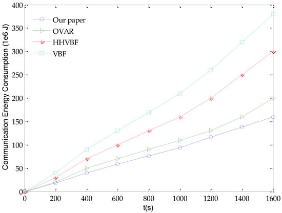 Energy is also an important factor to consider since the common sensor nodes in UASNs are mostly battery-powered. The storage capacity of batteries is limited and underwater charging technology is more difficult to achieve. For common nodes, its energy consumption is mainly used to collect sensor data, send data packets, forward data packets and receive data packets, and we define these energy consumption as communication energy consumption. Therefore, communication energy consumption is an important measure of the life of a common sensor node. That is, the less energy consumption to deliver the same packet to the aggregation node can prolong the life of the node, thereby prolonging the life of the entire network. Therefore, in order to verify the performance of the glider-assisted link-disruption restoration mechanism, we compare its communication energy consumption with OVAR, HHVBF and VBF, as shown in Figure 7.