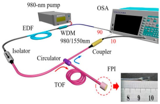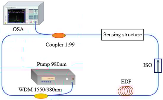 41] found the potential of tunable single wavelength fiber laser, and introduced an in-line Mach–Zehnder interferometer (IMZI) module with a waist diameter of 10 µm and a total length of 38 mm as a tuning device into an erbium-doped FRL to detect the strain. The whole experimental setup is shown in