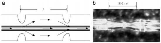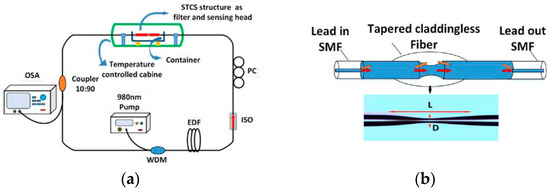 Figure 3b. The STCS fiber structure acted as the sensing head and filter of the laser system simultaneously. This multimode interference (MMI) based on fiber laser sensing system enhanced the SNR and narrowed the 3-dB bandwidth significantly. According to the experimental results, average sensitivity of the sensor reached 163.80 nm/RIU in the RI range of 1.333–1.399 and a sensitivity of 10.8 pm/°C was achieved with temperature ranging from 8 °C to 80 °C. High optical SNR (~40 dB), narrow 3-dB bandwidth (<0.12 nm) and high resolution were also achieved due to this laser sensing system. The easy fabrication and the wide temperature measurement range make the sensor more applicable to most of the real environment, however, its sensitivity still needs to be improved and the tapered structure may make the sensor more vulnerable.