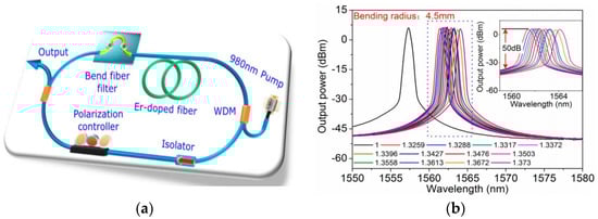 Figure 5b showed the measured laser output spectra with different RI and the magnified laser output spectrum with an output power of 5.8 dBm, high SNB of 50 dB and 3 dB bandwidth less than 0.3 nm. Experimental results show the proposed sensor had a red wavelength shift with an increasing RI, and the maximum sensitivity was 124 nm/RIU when a 4 mm bending radius was selected. It can be seen that with an easy fabrication of the sensing system, the sensor still maintained a relatively high sensitivity.