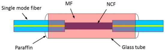 49] proposed a novel sensor to detect the magnetic field in 2016. Like what Bai did, a MF-deposited SNCS fiber was also inserted into a FRL and worked as the filter and sensing head of the sensor. To make this structure, a piece of no-core fiber (NCF) was spliced between two SMFs. The MF was coated on a glass tube with both ends wrapped with paraffin, which was used to contain the combination of the NCF and two SMFs. The schematic configuration of the structure is shown in