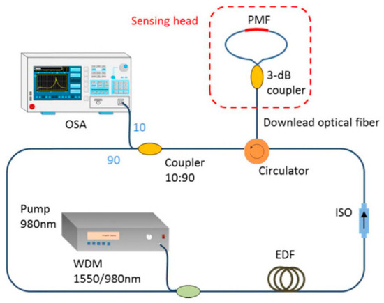62] aimed into the temperature measuring domain, and spotted the trend that the designing of Saganc loop sensor tends to be more complex to achieve a higher sensitivity, so they tried to combine FRL with the Sagnac loop to simplify the structure of this kind of sensors, meanwhile, maintain or enhance the sensitivity of the sensor, and bring them a higher SNR and narrower 3-dB bandwidth. So, they produced a temperature sensor using FRL with a reflective Sagnac loop. The sensing head was fabricated by an insertion of the reflective Sagnac loop, which is constructed of a piece of polarization maintaining fiber (PMF), into the FRL through a downlead optical fiber and a 3-dB coupler. A circulator is also adopted into this system for coupling the propagating light signals. The structure of the sensing head is shown in