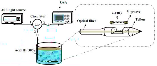 70]. They demonstrated characteristics of the fiber laser sensor system based on an etched-Bragg grating sensing probe. The sensing element is based on an etched fiber Bragg grating (e-FBG) which is formed by using the wet chemical etch-erosion and placed into a fiber cavity. A Teflon V-groove mount is chosen for its quality of non-reactant to HF and decreased mechanical vibration for e-FBG, and used as a protective mount for the fragile e-FBG. To detect the wavelength shift in the etching process, an experimental system is set up with an amplified spontaneous emission, an optical circulator and an optical spectrum analyzer. This setup and the designing of the fiber mount is shown in