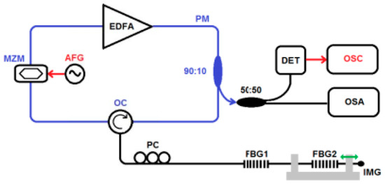 Figure 13, they equipped a fiber loop of EDFA based FRL with an amplitude Mach–Zehnder modulator (MZM) which is driven by arbitrary function generator to construct an actively mode-locked (AML) configuration. In their reduction, the FBGs can be addressed respectively when the MZM is driven by a signal with a fundamental frequency of 4.38 MHz and 4.28 MHz, which means that the temperature and strain changes in the ambient environment can be detected by monitoring the changes in lasing wavelength. The AML technique they proposed also solved mode-competition problem in CW EDFA-based FRL.