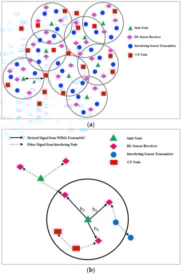 (a) A realization of , and transmitter processes; and (b) an illustration of sink-to-sensors communication using NOMA under interference of other sink, sensor and CT nodes.