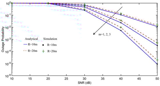 Figure 2 shows the outage probability of each m-th user under the impact of different transmission radius of the sink node. The solid and dashed curves are analytical results obtained by plotting (9), while simulation results are shown in “●” and “+” to validate our derivations. It can be observed that increasing results in higher outage probability due to increased path loss. Further, the ordered NOMA users have different outage performance, as each has a different channel condition.
