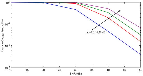 Impact of on average outage probability. The bottom first line (blue) is for k = 1 dB, second line (red) is for k = 5 dB, third line (green) is for k = 10 dB, and fourth line (purple) is for k = 20 dB, ordered by the direction of the arrow.