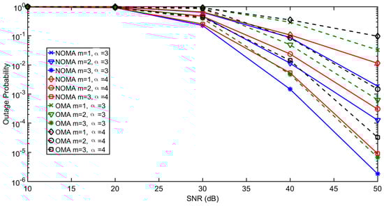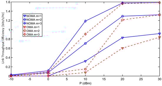 Figure 3 demonstrates the average outage probability under different interference levels , defined immediately after Equation (2). Reducing expectedly lowers the outage probability. Figure 4 further shows the outage probability of each m-th user under the impact of different path loss α. The results show that NOMA achieves lower outage probability than OMA for different values of α. The link throughput efficiency of each m-th user with increasing transmit power of test transmitter (sink node) are shown in Figure 5. NOMA achieves better throughput efficiency than OMA, as all the ordered NOMA users have lower outage probability than their OMA counterparts.