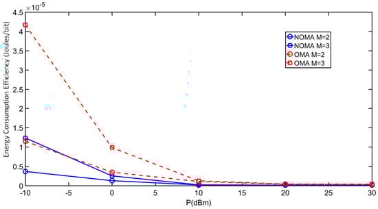 Figure 6 shows the energy consumption efficiency comparison between NOMA and OMA as a function of transmit power P. The results are obtained by considering two and three users. The power allocation coefficients and SINR thresholds for = 3 are given in Table 2. For M = 2, they are chosen as , and respectively. Further, Farads for 70 nm CMOS technology [33], channel bandwidth MHz, samples to represent one bit, and circuit power consumption = 20 dBm. Overall, NOMA achieves better than OMA due to a lower outage probability which results in larger in Equation (19) and consequently higher . However, the of both schemes are comparable beyond a transmit power of 15 dBm, which indicates the importance of optimizing the power and rate allocation in NOMA based UWSNs.