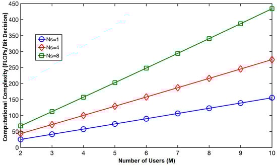 Since sensors have limited processing capacity, it is necessary to also analyze the complexity requirements of NOMA for these sensors. For downlink (sink-to-sensors) communication, the required complexity for the scheduled sensor receivers will be the complexity of their SIC units to process the received NOMA message. Figure 7 shows the computation complexity in terms of the number of floating-point operations (FLOPs) per bit decision, i.e., the number of FLOPs needed to decode one bit, obtained using Equation (23), under different M ordered users and Ns samples used to represent one bit. The results expectedly show the receiver’s complexity increases with M and Ns.