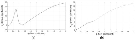 Turbine characteristic curves. (a) Torque coefficient vs. flow coefficient; (b) Power coefficient vs. flow coefficient. Dashed line: experimental curve. Solid line: approximated curve.