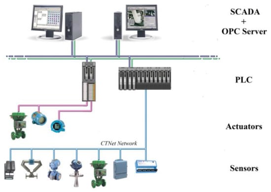 The data from the sensors is collected by a Beckhoff system, which turns both analog signals into fieldbus signals. The connection between Beckhoff and Programmable Logic Controller (PLC) is carried out by CTNet network of Control Techniques. CTNet fieldbus is a 5 Mbit Token Ring network that supports peer-to-peer communications. Finally, the SCADA is connected to the PLC by means of an OLE for Process Control (OPC) server/client configuration. Figure 5 shows the network topology used to collect data from sensors.