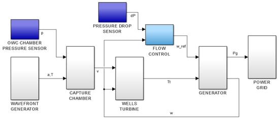 For this purpose, as has already been mentioned before, a complete wave-to-wire plant model has been implemented. Figure 8 shows the block diagram of the mentioned plant model, which basically estimates the air flow through the turbine taking into account different wave parameters at the surroundings of the breakwater of Mutriku. Once the value of the air flow velocity has been established, the turbine produces the mechanical torque that makes the generator to rotate. The rotational speed of the turbo-generator is used as closed-loop element, which is necessary in addition to the pressure drop measurement from the sensor to estimate the reference rotational speed.