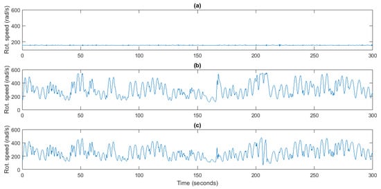 Turbine rotational speed, ω (rad/s). (a) Uncontrolled plan; (b) PI-based speed control; (c) Flow Control.