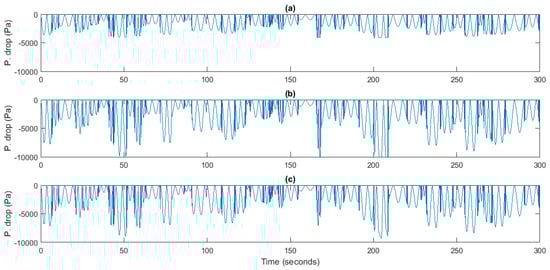 Pressure drop, dP (Pa). (a) Uncontrolled plant; (b) PI-based speed control; (c) Flow Control.