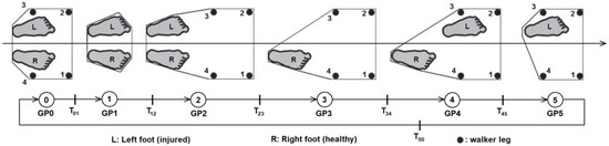 Gait Phases (GP) during a walker step (the polygon delimits the support area). GP0: the walker is resting on the floor; GP1: the walker is flying; GP2: the walker is on the floor waiting for the injured foot to move forward; GP3: the injured foot is moving forward; GP4: waiting for the healthy foot to move forward; GP5: the healthy foot is moving forward.