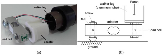 Load cell attached to the walker leg: (a) Photo; (b) Side view.