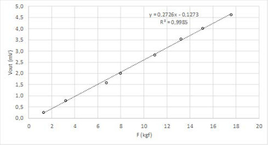 Using linear interpolation, validated by an R-squared value close to 1, the following relationship was found between the output voltage in mV (Vout) and the input force in kgf (F):