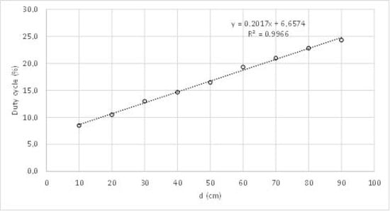 The characterization of the LIDAR was performed pointing the LASER to a moving target and measuring the duty cycle (δ) of the PWM signal. The sensor was fixed at one end of a graduated ruler while the target could move freely anywhere from 10 to 90 cm. The distance was measured directly from the ruler, with a resolution of 0.5 mm and the pulse width was measured using a universal counter, model PM6669 from Philips (Amsterdam, Netherlands). Figure 5 presents the obtained results.