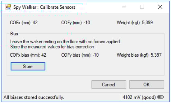 The “Calibrate Sensors” sub-window (see Figure 8) serves to extract the offset error of the measurement system. With the walker resting on the floor, with no external forces applied, the user registers the COF coordinates and the weight of the walker frame. These residues are offset errors that will be cancelled later during normal operation. COF residues are subtracted from Equations (1) and (2), while the weight residue is subtracted from the numerator of Equation (4).