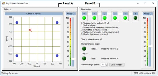 Stream Data sub-window. Panel A presents data related with force balance (the dark circles represent the walker legs) and panel B presents data related with motor coordination.