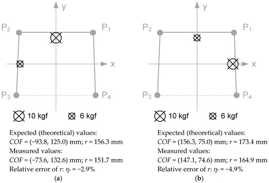 Two well-known lead weights were applied in precise locations of the walker frame to compare the COF measurements against the expected values. Figure 10 shows the two arrangements made: on the left, the 10 kgf weight was applied at the point (0, 200) mm and the 6 kgf weight was applied at the point (−250, 0) mm; on the right, the 10 kgf weight was applied at the point (250, 0) mm and the 6 kgf weight was applied at the point (0, 200) mm. For each arrangement, the measured value of COF and its distance to the origin (r) are presented, as well as the corresponding expected (theoretical) values.