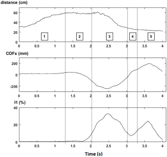 - During gait phase 3 the user transfers part of his weight to the left to compensate the lack of support on the injured foot [31]. While the injured foot moves forward, the distance returns to the base value (around 30 cm) and COFx returns to the origin, thus making the machine enter in stage 4.